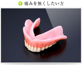 「生体用シリコン」という特殊な弾性のあるゴム質の素材を、入れ歯の内側に貼ることで痛みをなくします。「無痛」入れ歯と呼ぶことができるぐらい痛みはでません。