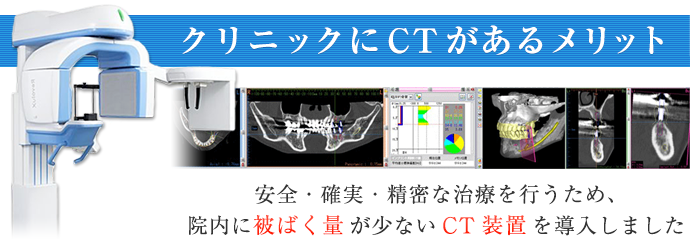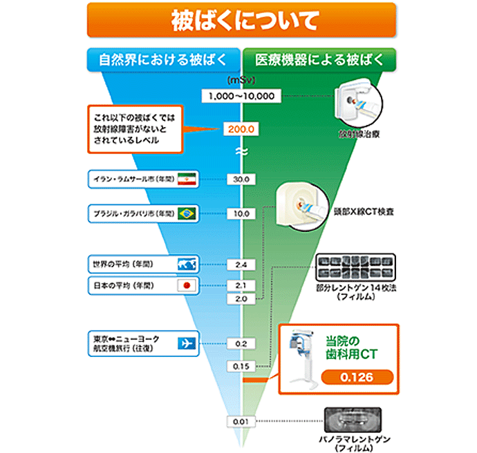当院ならCT撮影は何度でも無料。しかも歯科用CTなので、一般医科用CTに比べ被ばく量をわずか1/8~1/50まで軽減しています。