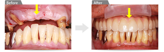 歯があった状態と同じ形態に歯肉が完成。真ん中に見える物はインプラントの一部です(黄色い線の歯肉ラインの厚み、位置がほぼ右左対象に完成)。