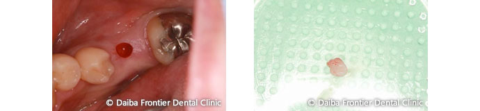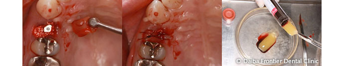 抜歯と同時にインプラント手術を行います。抜歯部位には人工骨と、患者様自身から採血して遠心分離機によって抽出したフィブリンを使用し、再生療法を行う流れです。 -