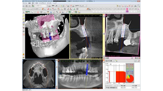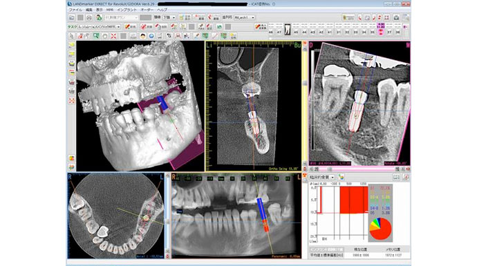 当院はCTを完備しています。こちらはCTシミュレーションソフトの画像です。難しいケースでは術中にもCT撮影を行い、位置や方向を確認しながら施術を進められるので、インプラントを精密に埋め入れることが可能です。安全が最優先なので、これで失敗や事故などを防ぐことができます。