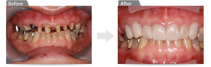 ・前歯6本のダイアモンドセラミック治療、左上3番目の抜歯および同時インプラント埋入